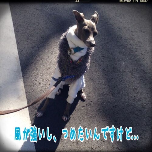 もふもふ重ね着ジーノ… お散歩開始5分も経たずに固まる。 相変わらず強風の度にフリーズ… 大好きな裏山ダッシュもヤル気なし。 ただ伸び〜るリードで自由に歩いている… 早々に裏山退散してお友達に会っても 強風に負けて無視…感じワルっ! そして、限界。 確…