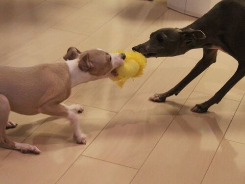1ヶ月前、お迎えした日の夜...さっそく引っ張りっこして遊ぶので えっ!もう仲良し!?!?と思いきや、ジーノの激しい嫉妬が数日続き... お昼寝はいつもソファの両端(´・_・`) 最初はジーノなりの躾なのか、ただ怒ってるのか分からず(´・_・`) どうしたものかと…