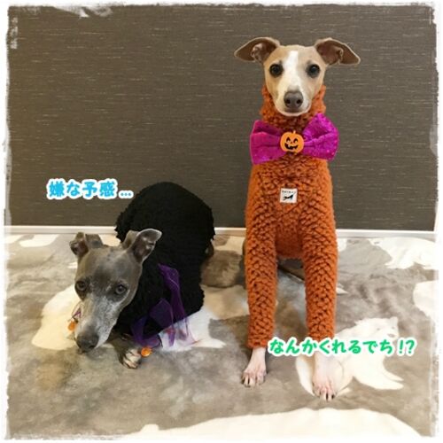 家では裸族のボクたち...服を着せられて、ママが何か企んでるー"(-""-)" ぽこぽこニットの色合いがHalloweenごっこにぴったりだって~(≧∇≦) ばぶティノが得意な頭乗せ♪ボクは興味ないから、ひとりでやって~( *´艸`) 首の飾りを交換して... ティノかぼち…