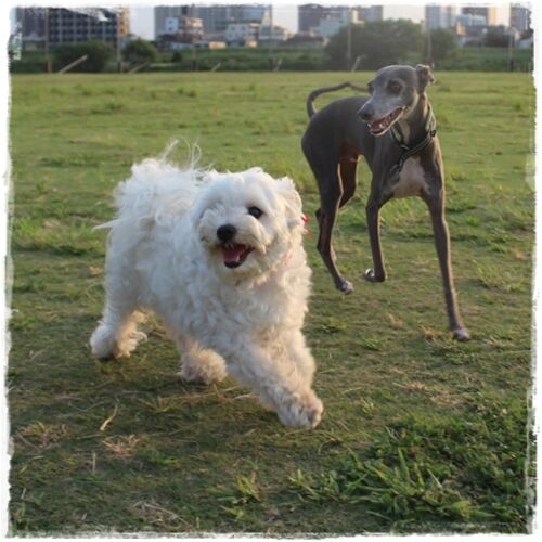 暑くなるとお散歩時間が変わっていつもの池のお友達に会えなくなるけど...ジーノの幼なじみ、ぷっぷちゃんとゴルフ⛳ランで会えた~! 久しぶり!の優しいキス~( *´艸`) そして、遊ぼう~~(≧∇≦)ティノゴンみたいに悪魔顔なんてしません(笑) ジェントル…